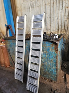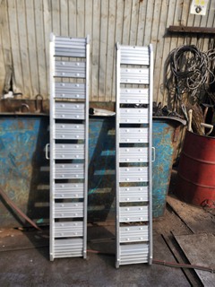 軽トラックや小型トラックの機材の積載のに積み下ろしに使用されています。最大荷重は500キロです。(二本セットでの合計です。)材質はアルミニウム合金です。軽量で耐腐食性に優れています。爪式のフック形状で弐台にしっかり固定することが可能です。ステップにプレス加工を施していて滑りにくい加工と滑り止め加工を施しています。