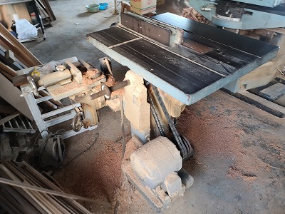 傾斜盤は木材をカットする時、側面に垂直のカット面が欲しい場合に使われています。テーブル上を手押し、送材により被切削材の縦挽き・横挽き・角度挽きなどの切断加工のほか、カッターによる溝付加工などもできる丸のこ盤で、作業範囲は広い。