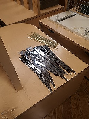 これは、壁面の取り付け金具に業務用の軸受けを取りつけて、その軸受けの上に天板を載せて固定し、そこに商品を陳列しているというものです。