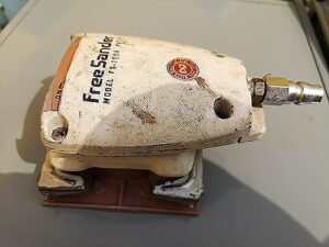 フリーサンダーは、エアーを送って、中のファンを回転させることによって振動を起こし、面に貼った紙やすりで切削などの加工を行う機械です。