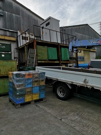 積み込み作業をしながら、次の荷物を番線で固定していくので