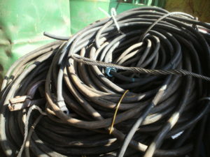 溶接に使われるケーブルは、細い銅線が中に入っています。 cab(辻馬車)に使用される強靭なタイヤがキャブタイヤケーブルの語源とされており、 工場や倉庫などの天井クレーンの他にも、 港湾、製鉄所、ゴミ処理場、鉱山、造船所などで使用される大型の産業機械用の給電線や仮設電源として使用されています。 さらに、新しい分野では風力発電機や太陽光発電設備、電気自動車の給電用ケーブルなどでも使用され、強靭でありながら柔軟性をあわせもつ特長を生かして幅広い用途で人々の暮らしを支えています それらを集めた単体で、ケーブルの両端にはターミナルがついています。 ゴム製の被覆が重く、ドラム缶一本にこの溶接ケーブルが入っていると200㎏とか300㎏など、意外に目方がのす場合があります。 溶接ケーブルは両端のターミナルを切って販売をしています。 最近では銅相場が上がっているので、この溶接ケーブルもまとまると意外に金額が上昇する傾向にあります。