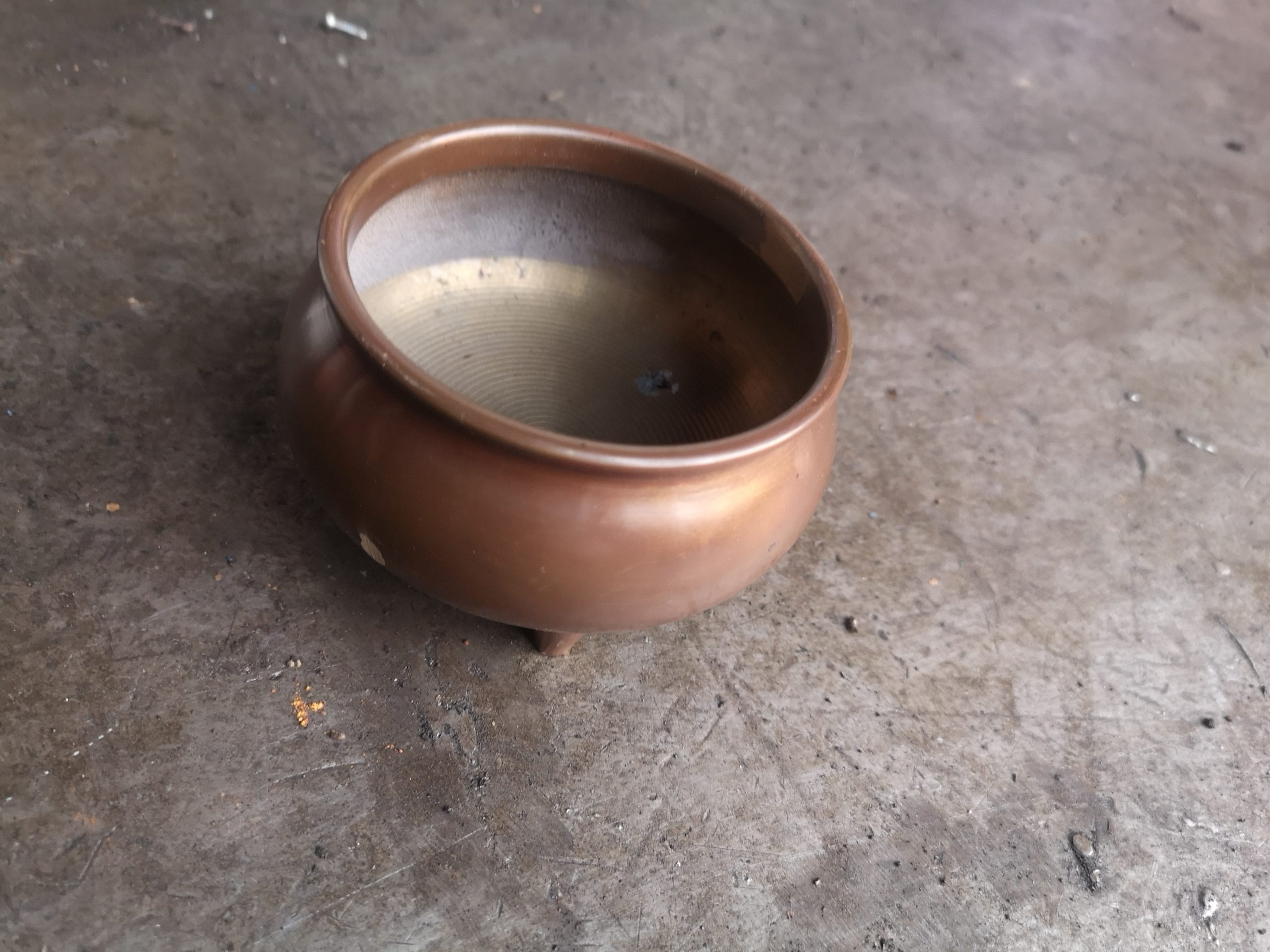 真鍮製三脚香炉は、中の灰などをきれいにとっていただいて、「込真鍮」として回収買取りを行っています。