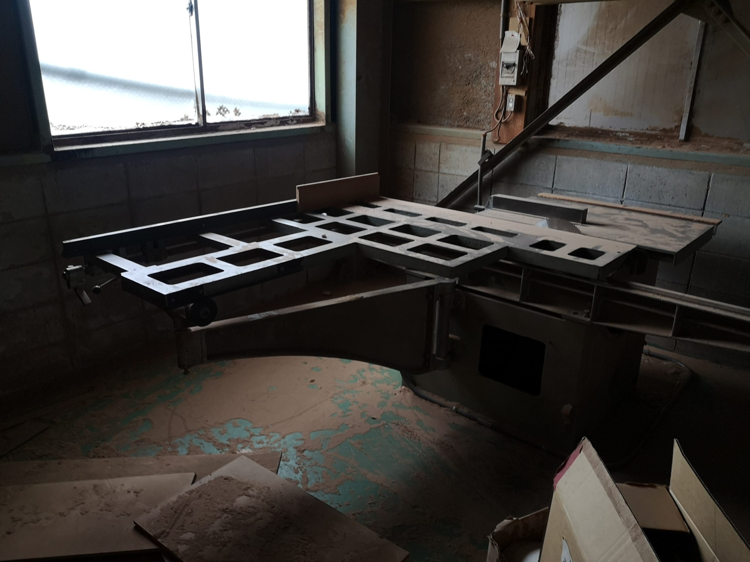 軸傾斜横切り盤は、スライド式の定盤があり、その上に木材をのせて切断をします。