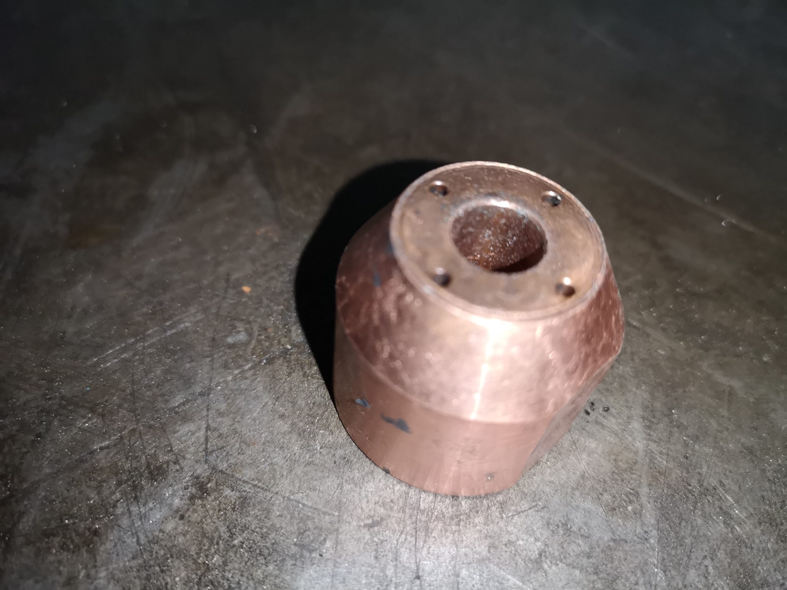 プラズマ切断は、大量の電気をコンデンサーにためて一気にスパークを起こし、エアーで吹き飛ばすようにしてステンレス、アルミ、銅、真鍮など色々な素材を切断します。