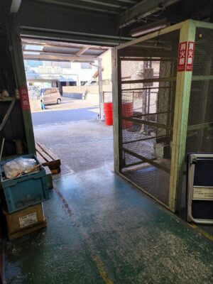 貨物用エレベーターは、天井式ホイストなどを利用して作られており、ボタンスイッチで1階2階の昇降が可能です。
