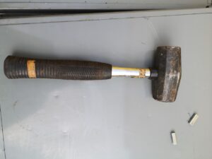 八角形とか四角形とか、いろいろな形がありますが、一般的な玄翁よりも大きくて重たい握りこぶしぐらいの鉄がついているハンマーです。
