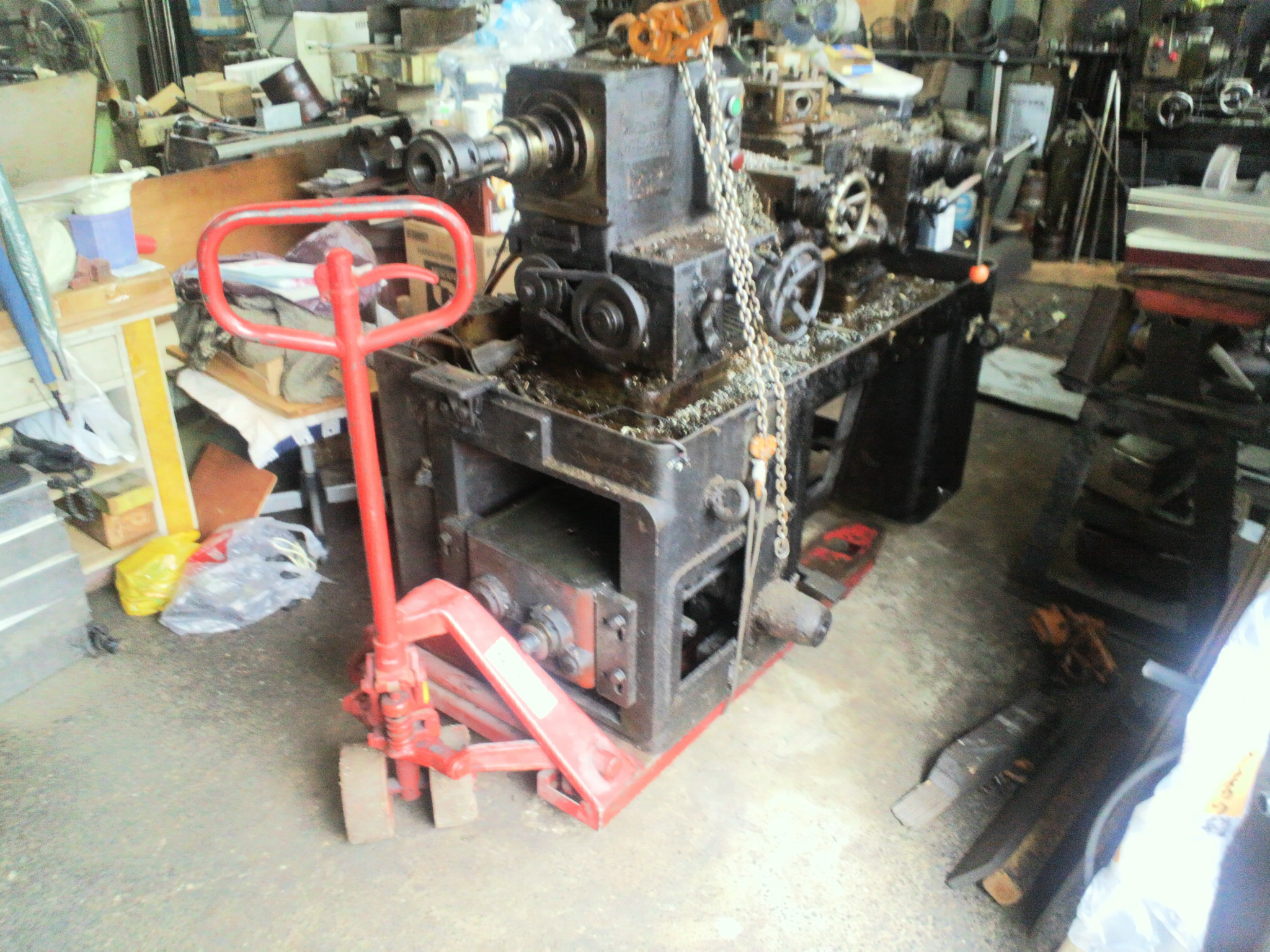 旋盤の引き取りに伺いました。 作業場が狭くて 他の他械にぶっからないように スピードローラーが固定できないので 安全に機械の運搬作業をするため ハンドリフトにチェーンブロックで固定して 運搬しました。