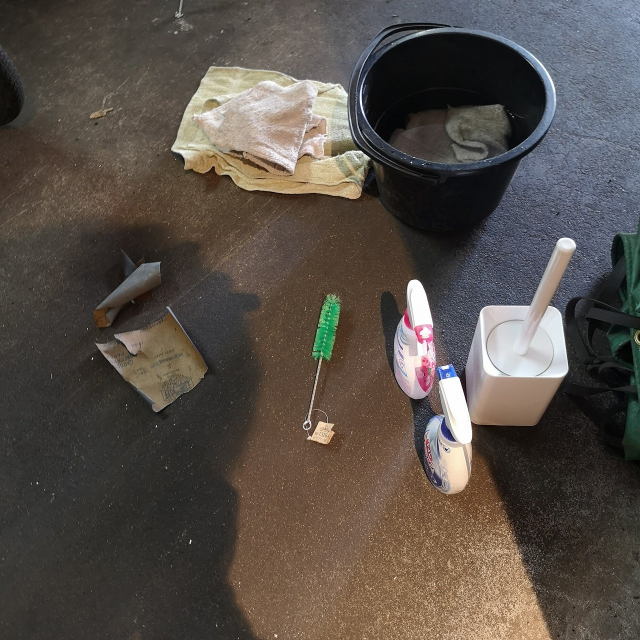 トイレの掃除のために道具準備中です。
