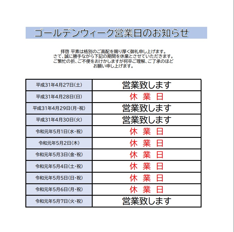 ・GW休暇:令和元年5月1日(水・祝)〜令和元年5月7日(日)まで