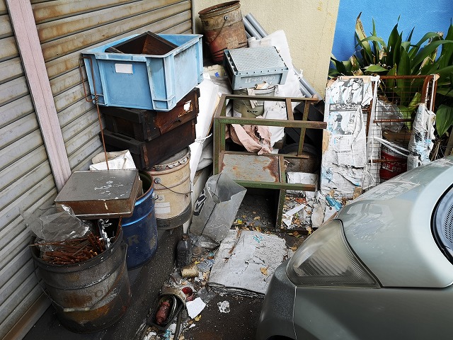 まずは入口シャッターの外側を綺麗に片付けていきました。