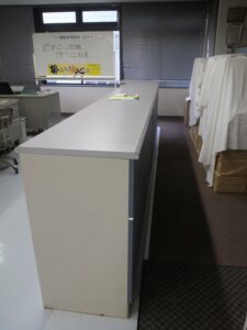 受付台・カウンターは、オフィスや店舗事務所、公共施設の入り口に設置され、来訪者対応、案内、簡単な手続きを行う事務重機です。種類としては負担ダード受付カウンター、コーナーカウンター、L型カウンター、ハイカウンター、ローカウンター、組み合わせ方のモジュール式などがあります。構造としては本体はフレームでできているものが多いのですが木製パネルで構成されたものもあります天板にはメラミン化粧板、木製のなどがあります受付代、カウンターを手付崩で買い取る場合はスチールフレームの上部の木製パネルやメラミン化粧板を外していただくと鉄屑のギロ材として買取が可能となります。