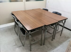 テーブルの構造としては、下の部分は折りたたみの鉄製角パイプで作ってあります。上部には木製の天板があるので、この天板を外していただくと「ギロ材」として買取が可能となっています。また天板の木製の部分は産業廃棄物となるので、これらは産廃として費用がかかります。他の鉄屑と一緒に回収可能な場合もあります。
